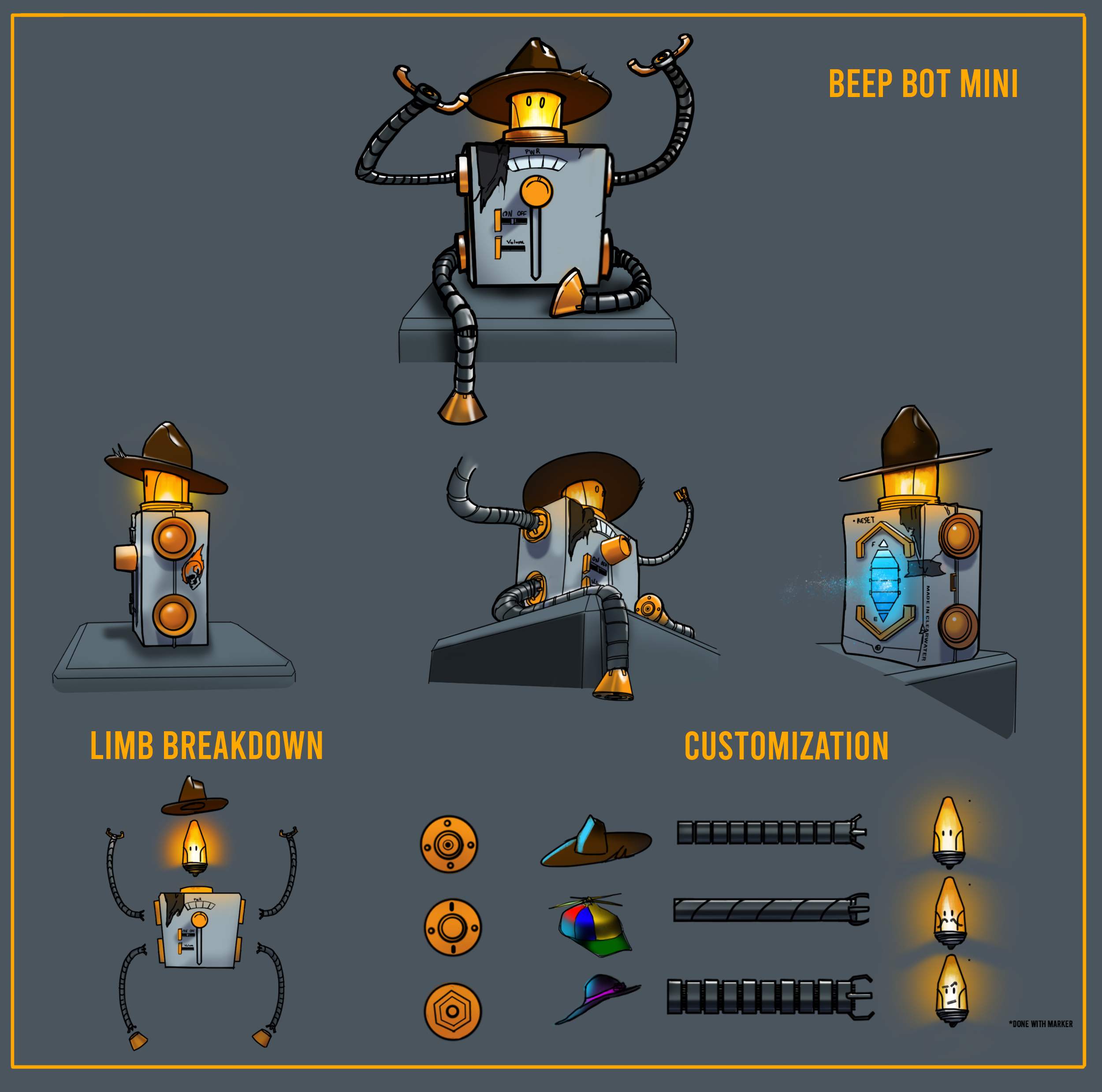 After we had some fun with our interactable prototype, we decided we wanted to take BEEP Bot Mini a step further: customizable! Since you’re Marco, you should have the ability to change up your creation, giving him new arms, legs, heads, and hats! So with that in mind, we threw the ideas over to a concept artist who was able to fully realize the character we had in our head!
